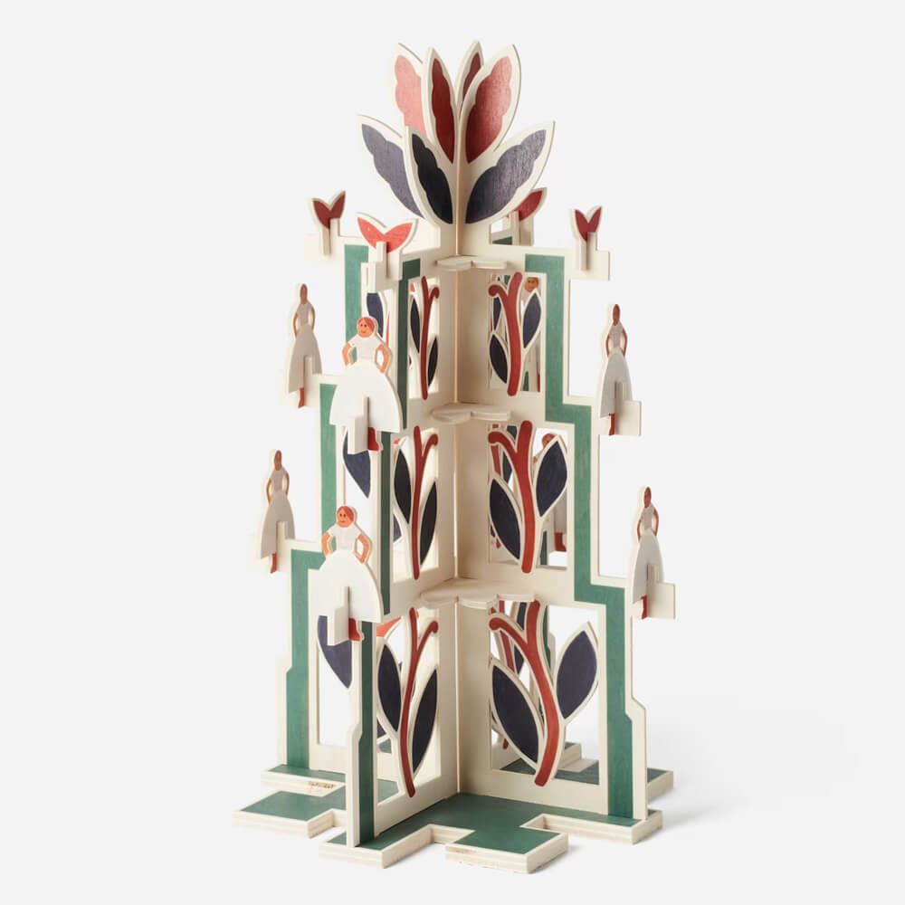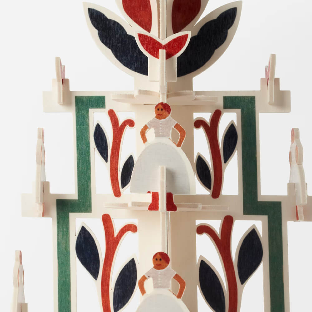 Inspirationen bakom denna enastående trädekoration fick paret Cyrén av sångleken ”Och flickan hon går i dansen.” En sånglek med rötter från 1800-talet som dansats såväl kring julgranen som midsommarstången. Sågverket är målat i julens färger rött, grönt och vitt.