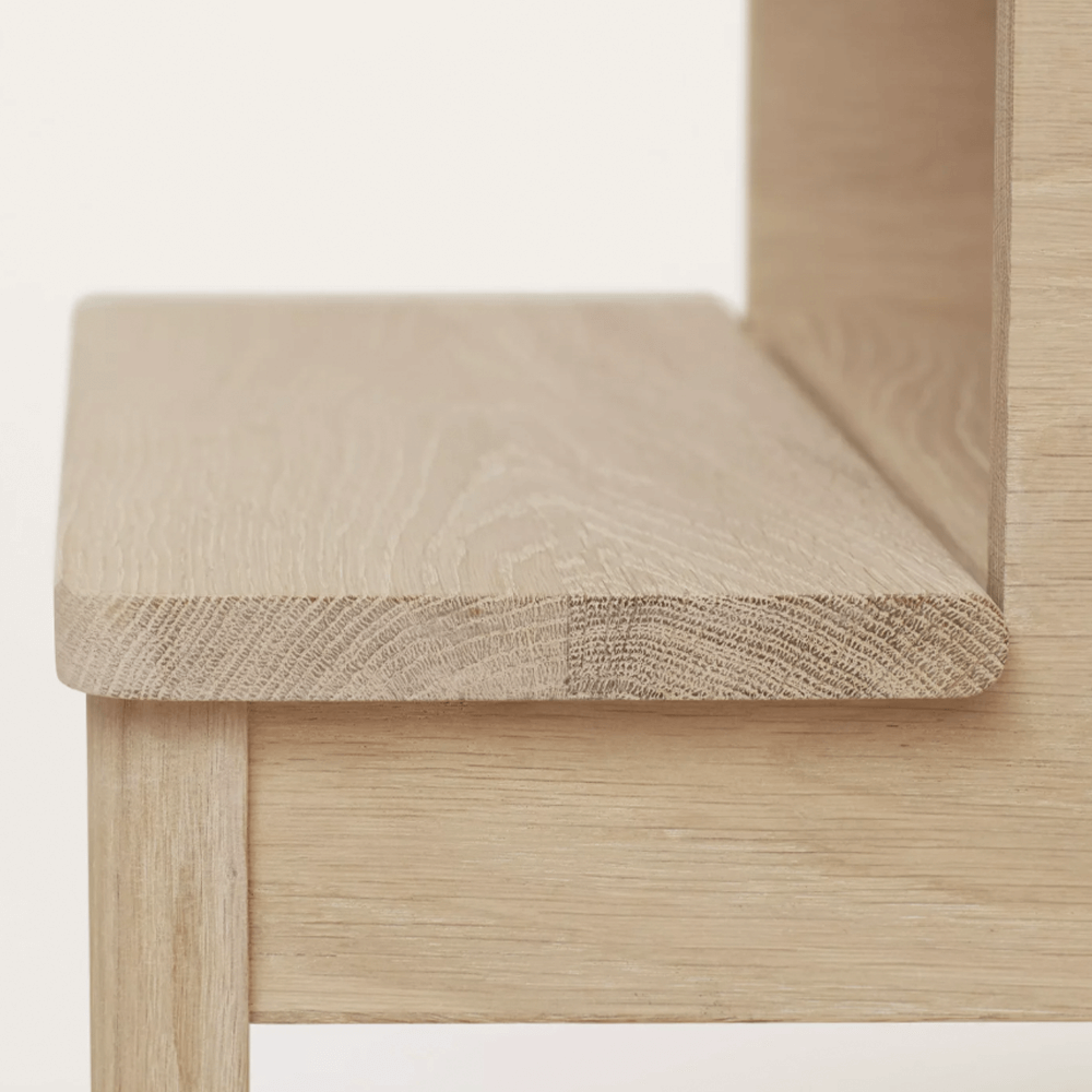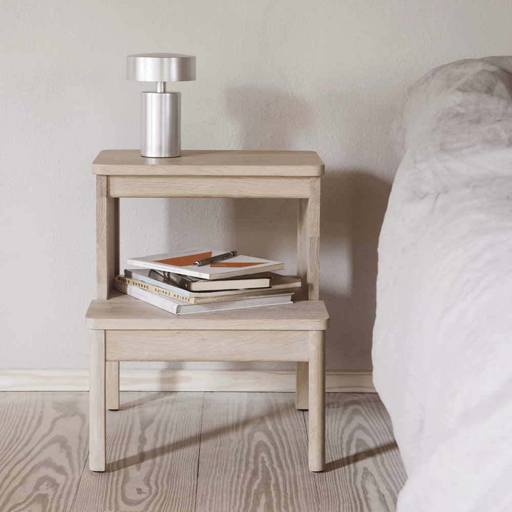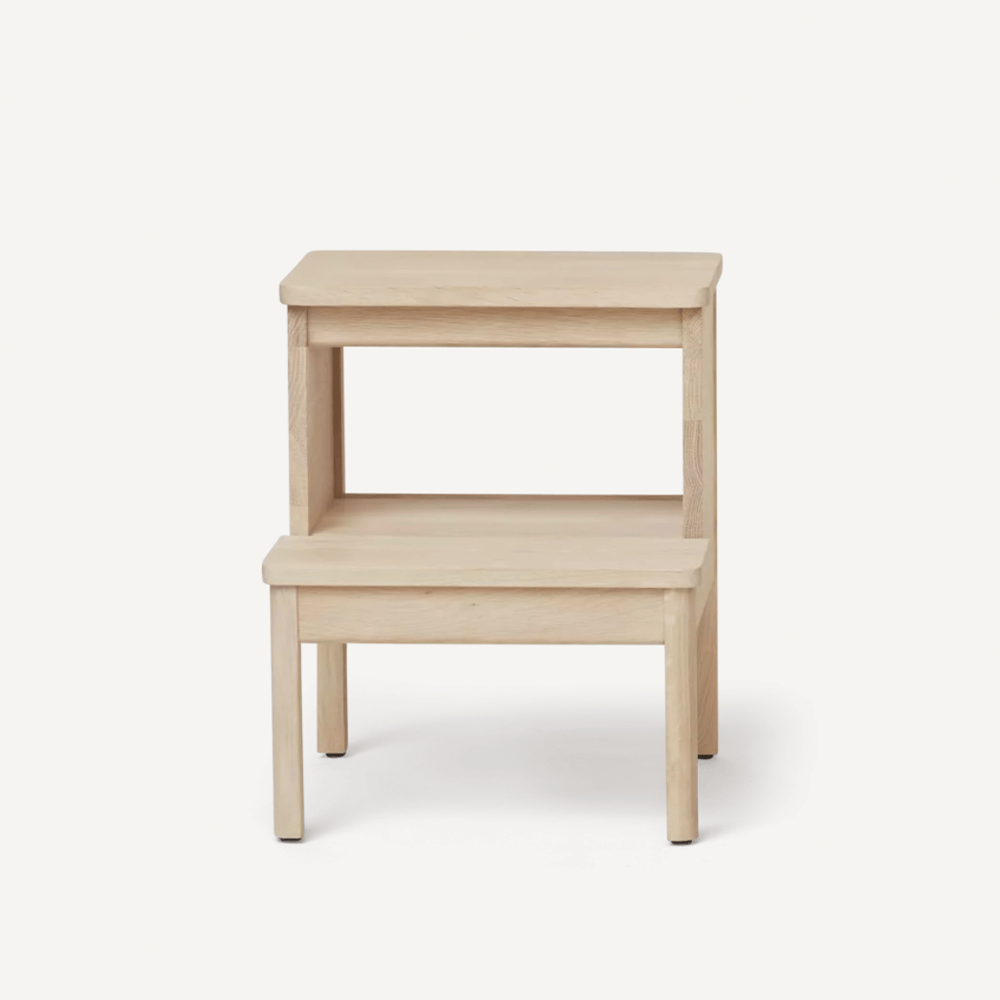 A Line Stepstool är en pall formgiven av Jonas Herman för Form & Refine. Denna robusta och mångsidiga, självbärande pall är utformad för att fungera i hemmets alla rum – som sittpall, nattduksbord eller extra avlastningsyta. A-linjens rena silhuett kompletteras av genomtänkta detaljer: mjukt rundade kanter, ett förlängt nedre steg som ger praktiskt förvaringsutrymme samt ett diskret integrerat handtag under det övre steget. Handtaget fungerar både som ett visuellt grepp och gör det enkelt att flytta pallen mellan olika rum.
