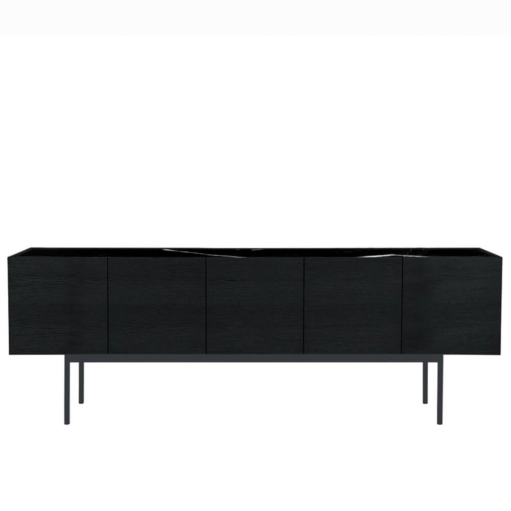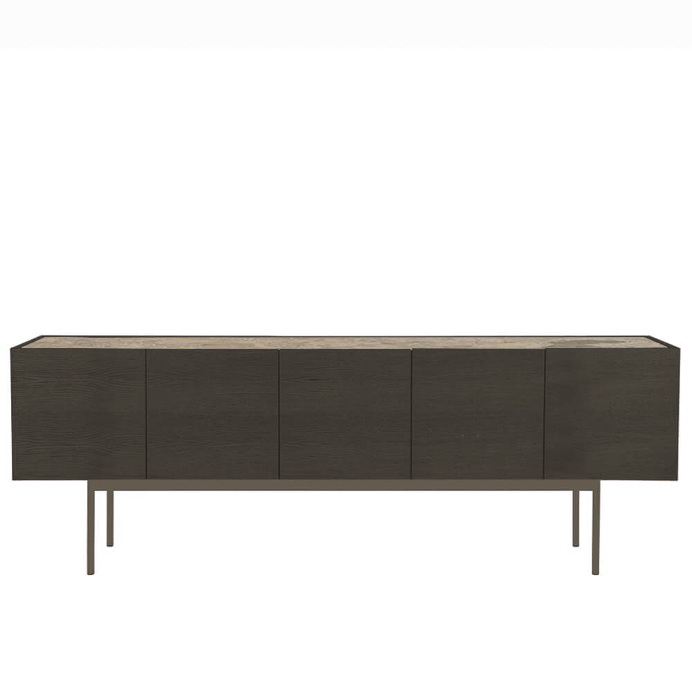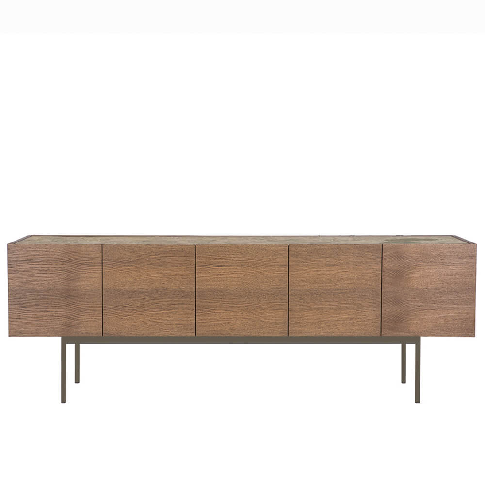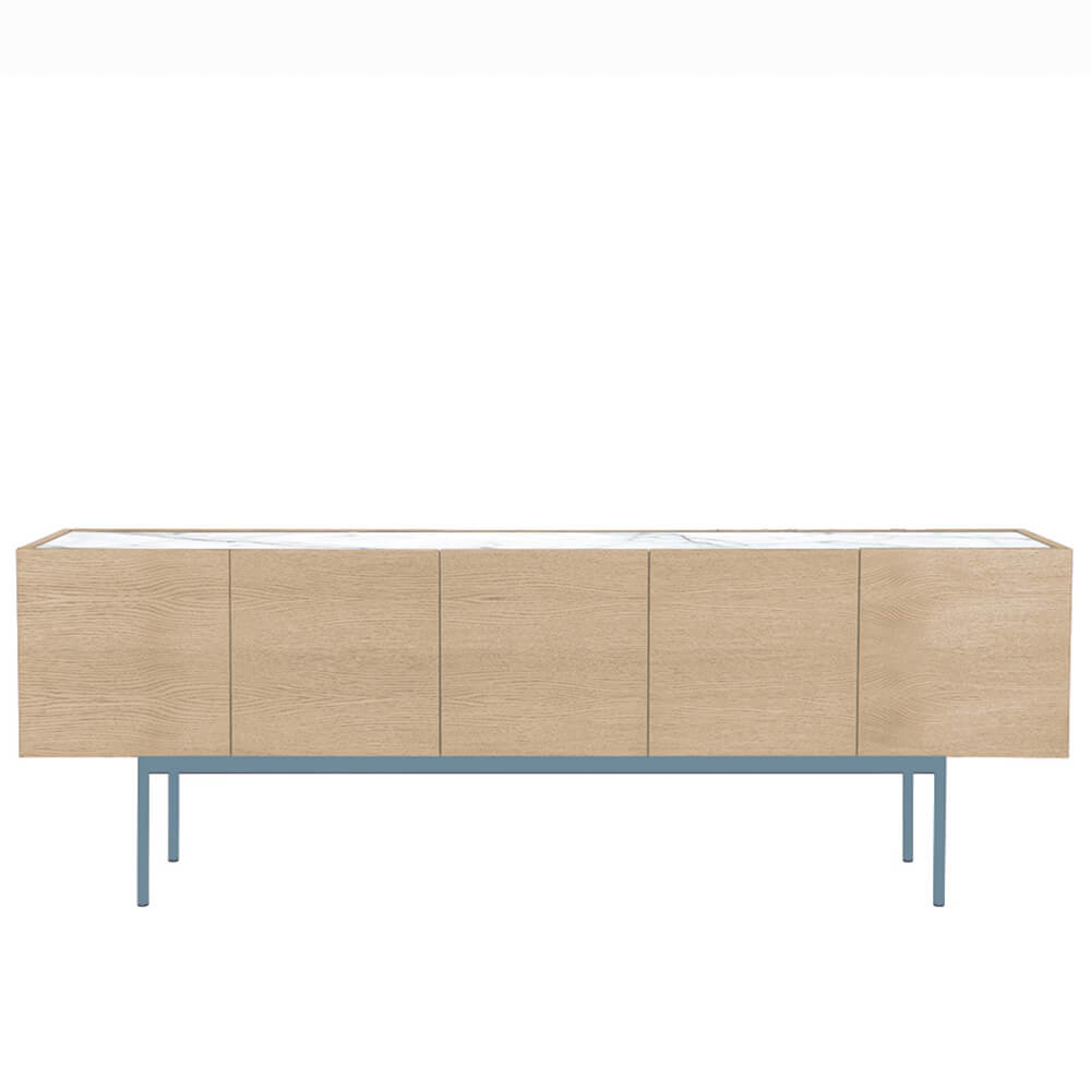 LUC Sideboard 200 är en bred skänk formgiven av Broberg & Ridderstråle för ASPLUND Collection. Sidobordet har en toppskiva i sten, fem dörrar i ekfanér och underredet är i lackad metall. Tillverkas i Sverige.
