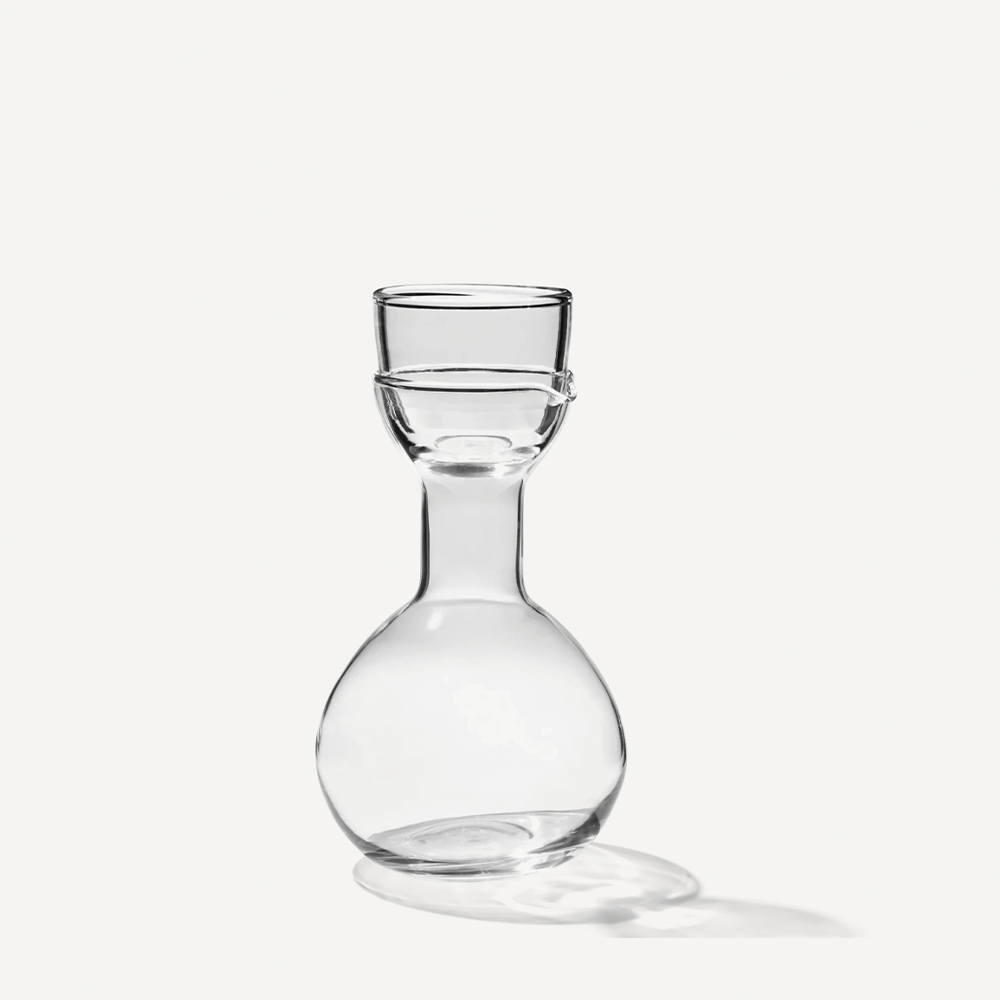 Det medföljande glaset är noggrant utformat för att vila ovanpå karaffen och fungerar som lock. Med sin rundade form ligger det bekvämt i handflatan och är generöst dimensionerat för te, kaffe, vatten eller cocktails. De tjocka glasväggarna gör det tryggt att använda även för varma drycker.