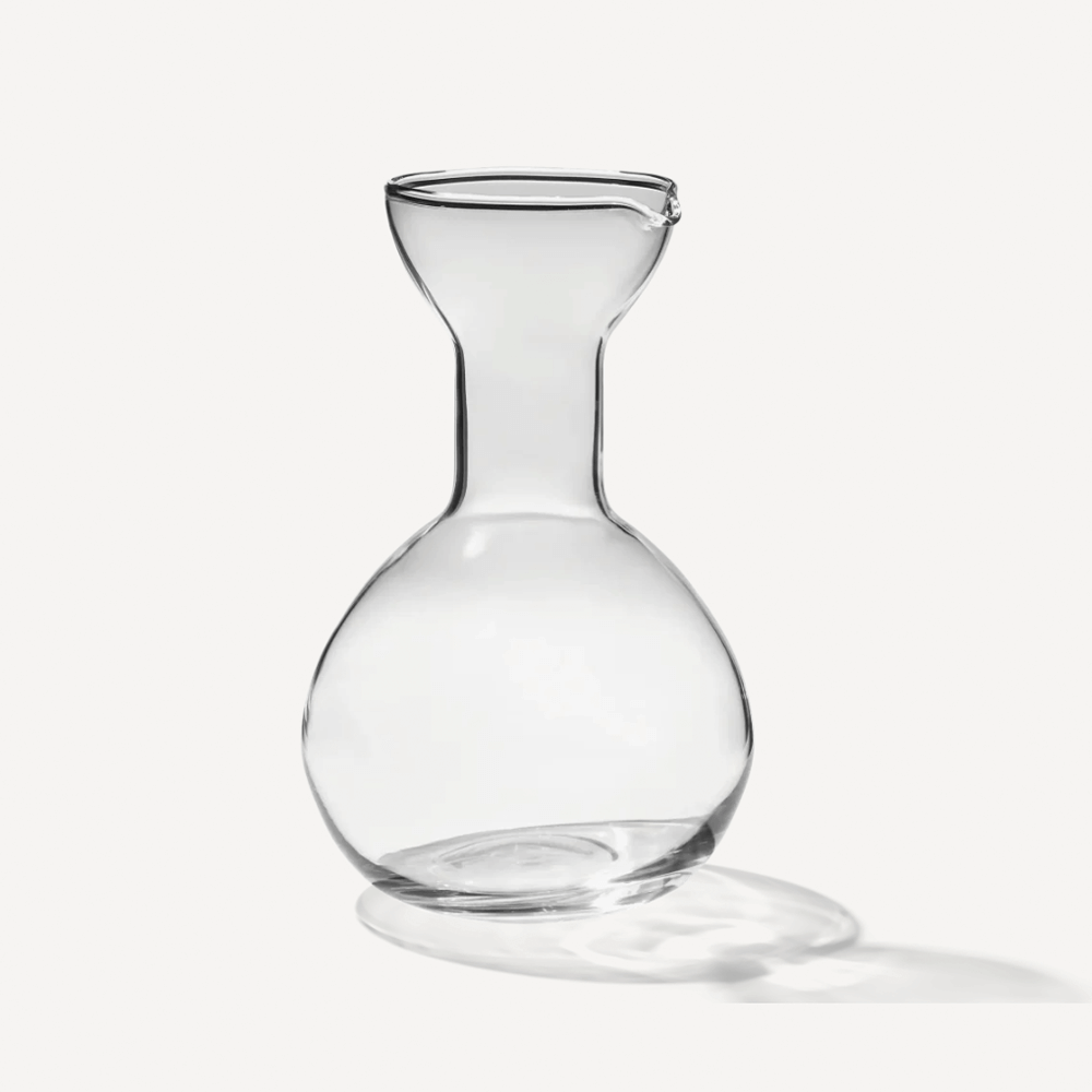 En karaff som hyllar det traditionella glasblåsningshantverket, med sin karakteristiskt levande yta, subtila ojämnheter och små luftbubblor som vittnar om det handgjorda uttrycket. Formen är inspirerad av arketypiska silhuetter och balanserar det tidlösa med det funktionella – lika självklar som vardagskanna som ett dekorativt objekt när den inte används.
