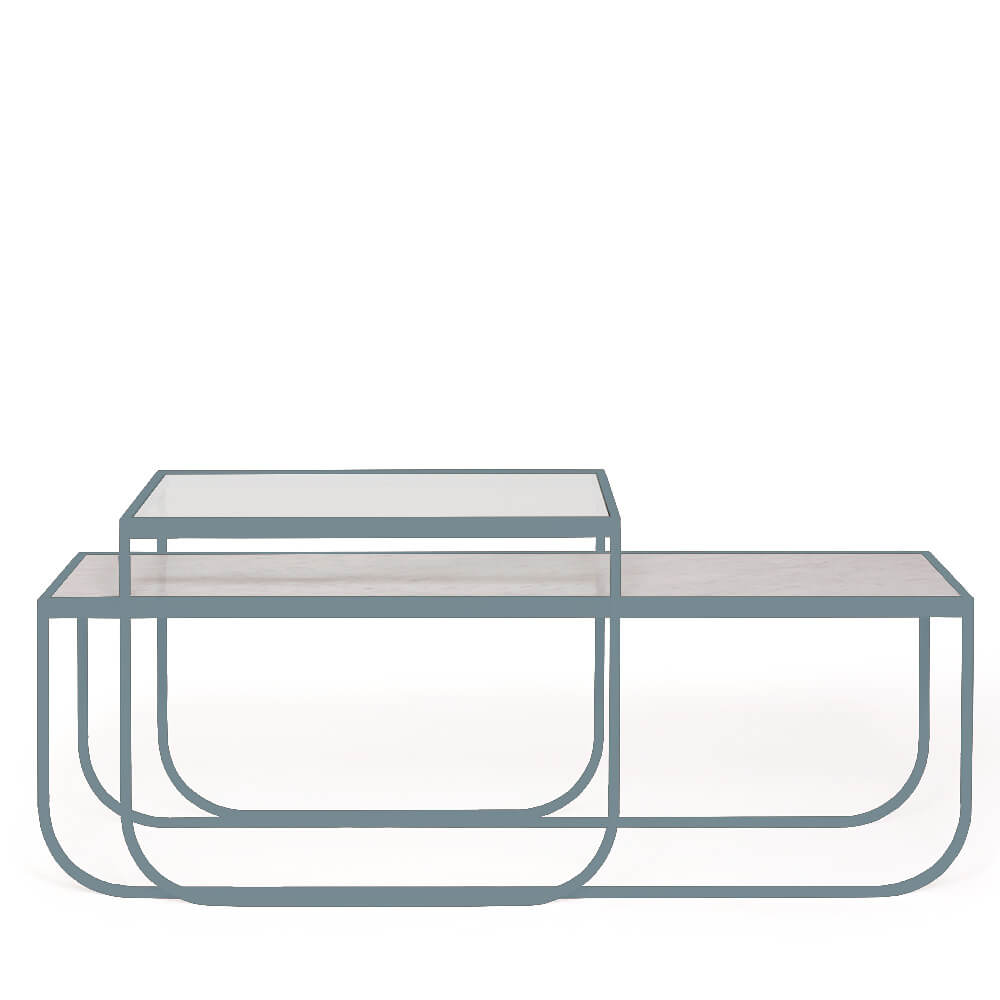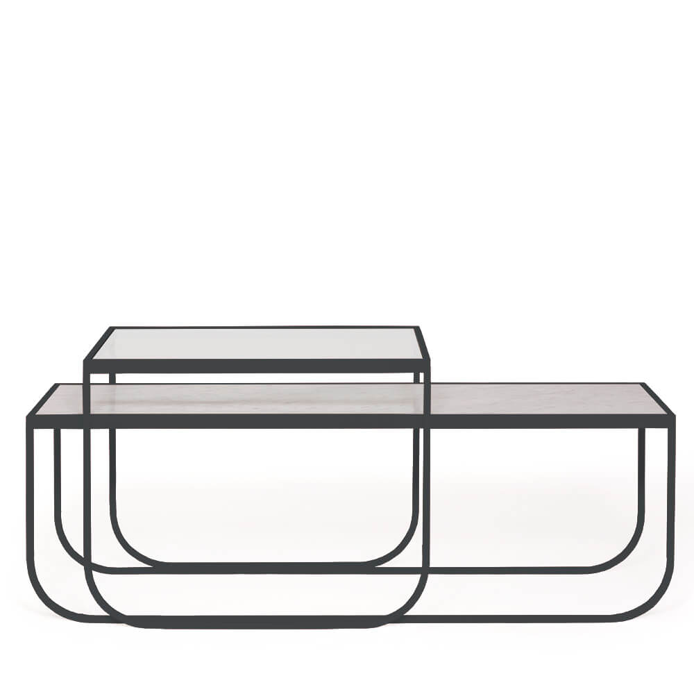 Det högre bordet kommer med en transparent glasskiva och det låga med sten eller lackat glas i samma kulör som stativet (glas på MDF+ skiva).