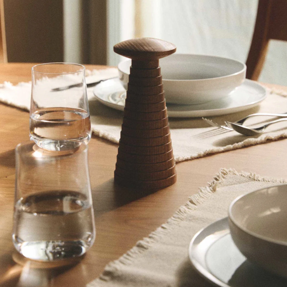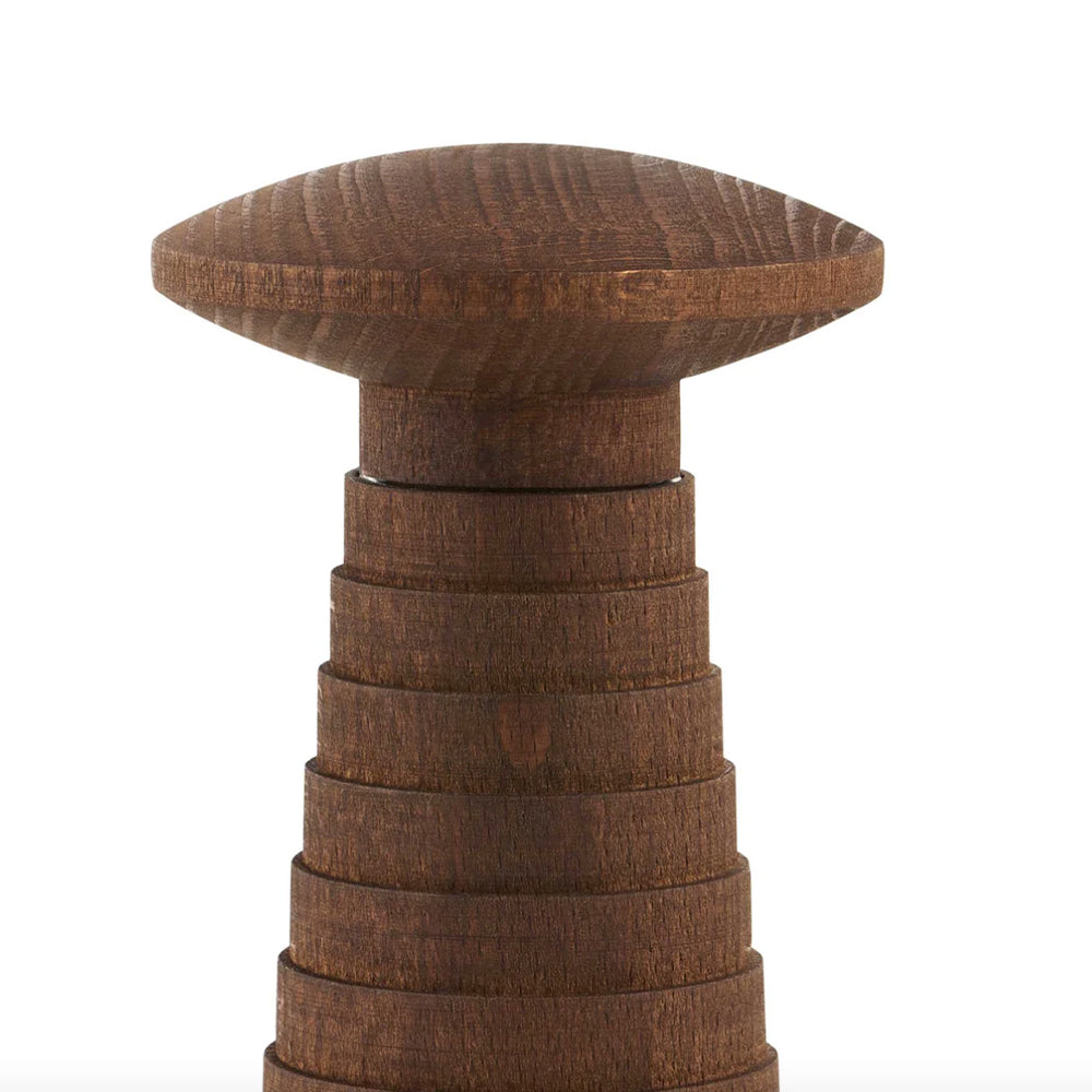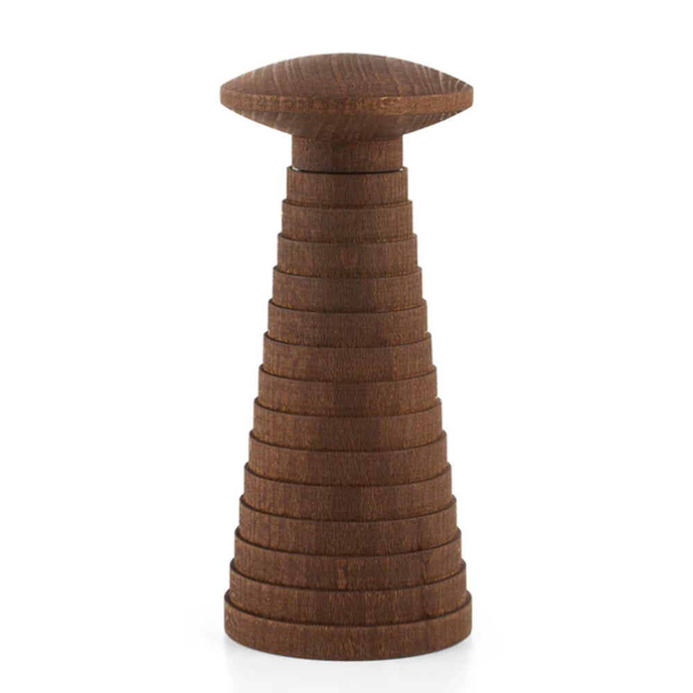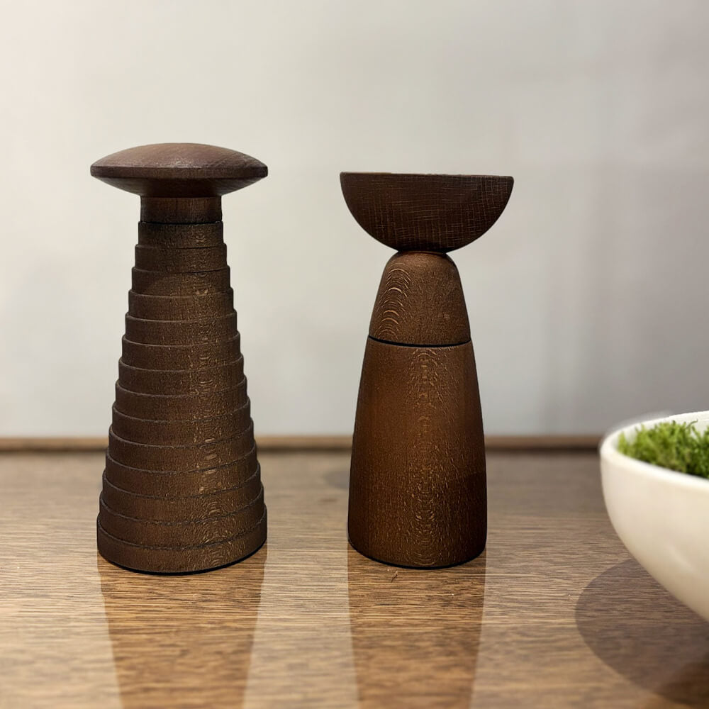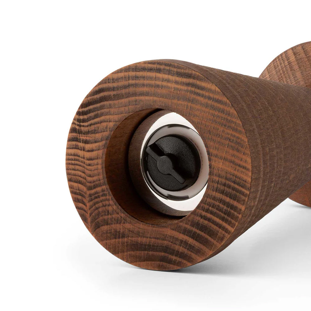 Den är tillverkad av mörkbehandlad bok och ytbehandlad med naturlig olja som framhäver träets ådring och ger varje kvarn ett unikt utseende samt en behaglig känsla i handen. Den skulpturala formen ger en modern tolkning av den klassiska tvåhandskvarnen och gör den lika dekorativ som funktionell.