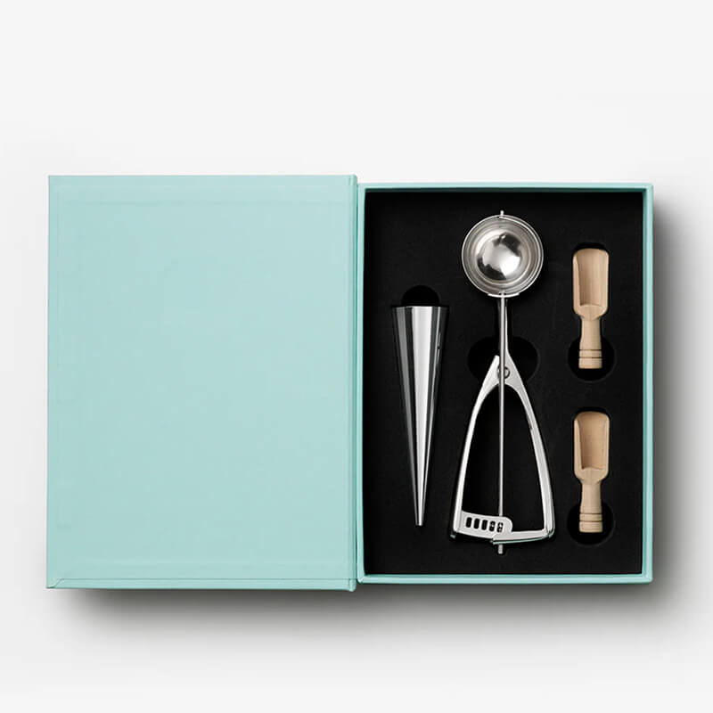 The Essentials glasset från Printworks är elegant formgivet och levereras i en stilren, bokliknande låda – perfekt för att förvara redskapen på ett diskret och smakfullt sätt. När du öppnar lådan väntar allt du behöver för att skapa den ultimata glassupplevelsen.